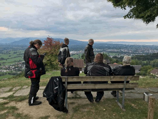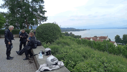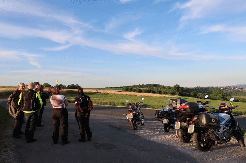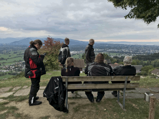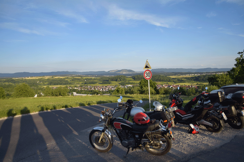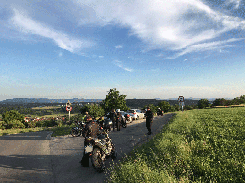 Auf der Höhe nach Neckartailfingen kurzer Stopp mit Rundumsicht auf Teck, Hohenneuffen und -Zollern (okay, Hohenzollern lag im Dunst, aber erkennen konnte man ihn trotzdem). Dann Walddorf-Häslach, Gniebel und B297 nach K-Furt, hoch auf die Härten und in Wankheim kurz noch Kirschen im SB-Modus gezogen, weiter am Bläsiberg vorbei nach Tü. Im Kreisverkehr so lange Kreise gezogen, bis alle Zwölfe wieder beisammen waren.