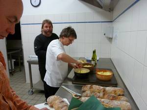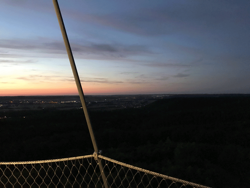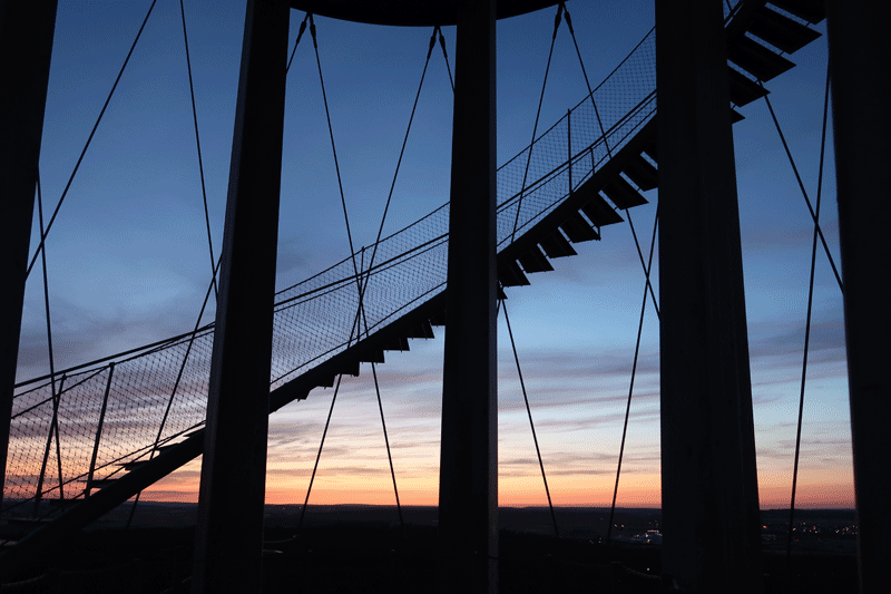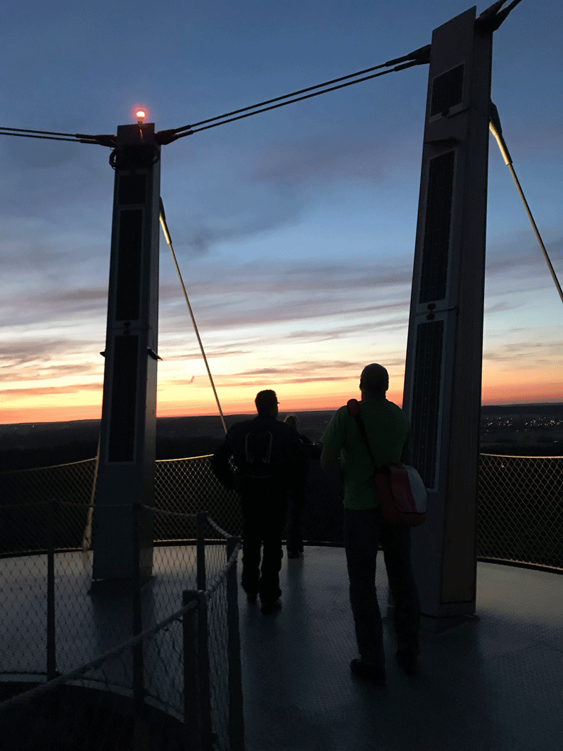 Leider kommen wir zum Sonnenuntergang knapp zu spät aber die Himmelsfarben sind auch so begeisternd, Lachsrote und türkisfarbene Streifen in seltener Intensität und die Aussicht vom architektonisch beeindruckenden Turm ist Weltklasse. Mit Chips, Sprudel und Kirschen haben wir noch ein wenig miteinander geplaudert bis zum allgemeinen Aufbruch, Ortsunkundige wurden eskortiert.